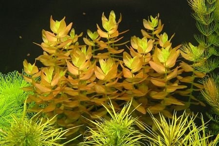 Aquascaping Pro Tip: Individually plant each stem about one leaf length apart in a somewhat close grouping, or in rows, for maximum visual effect . Use high light and the plant will grow "denser" (shorter distance between nodes on the stem), and will exhibit yellower coloration.